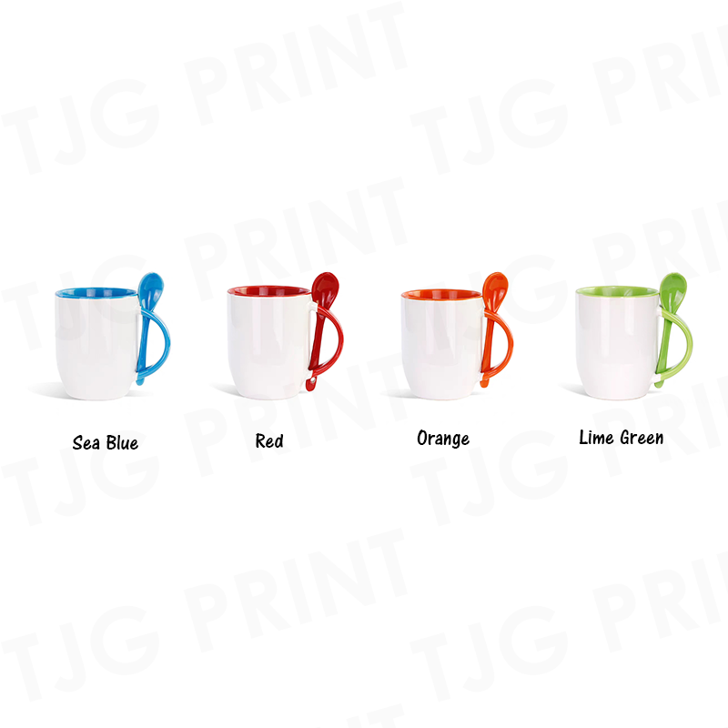 Featuring a vibrant inner colour and matching handle, this 300ml ceramic mug comes with a convenient matching spoon for stirring your favourite beverages. Available in four bright shades, it adds a cheerful vibe to your coffee or tea routine. Ideal for custom printing, making it a thoughful gift.