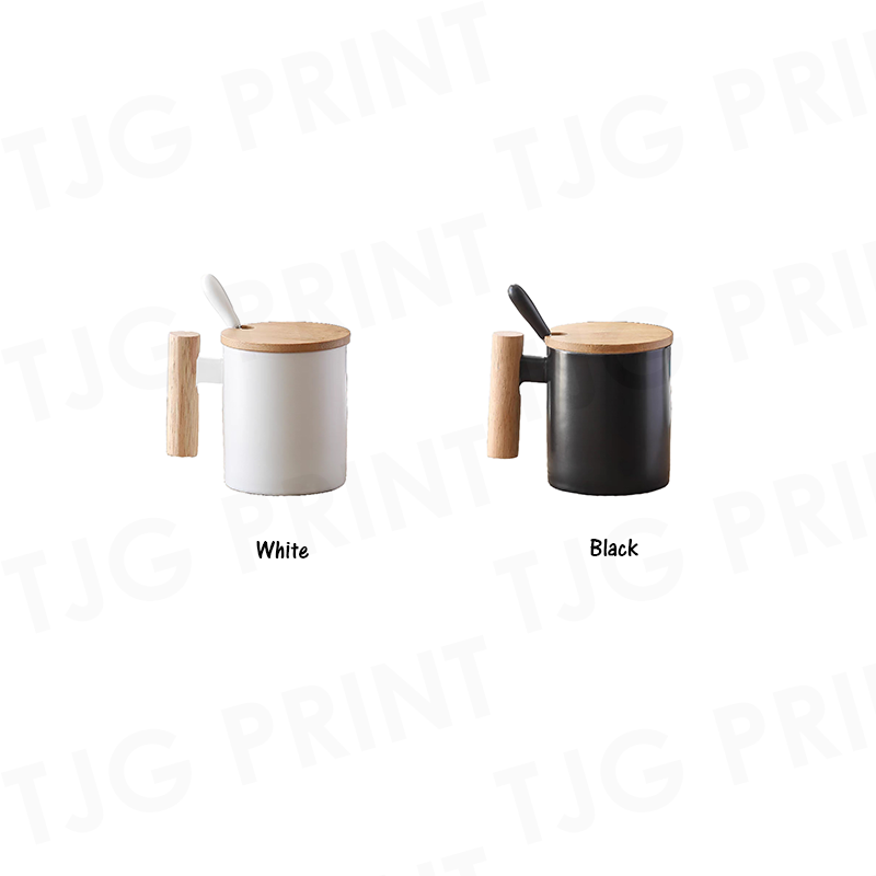 Ceramic coated mug with wooden handle, lid, and spoon. Suitable for hot or cold drinks, ideal for home, office, or customised gift.